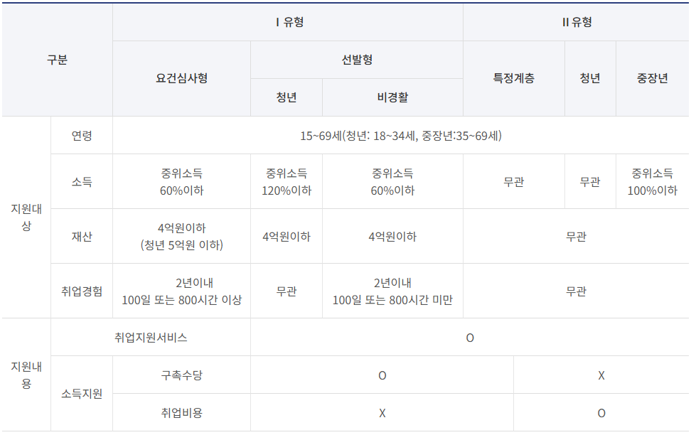 1유형은 취업지원과 함께 구직촉진수당과 같은 생계지원도 함께 받을 수 있으며 대상자는 저소득층 또는 청년 구직자, 경력단절 여성등이 대상입니다.