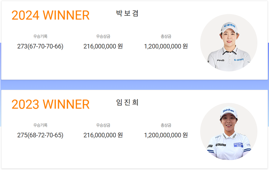 - 대회상금 : 총상금 12억원, 우승상금 2억 1600만 원