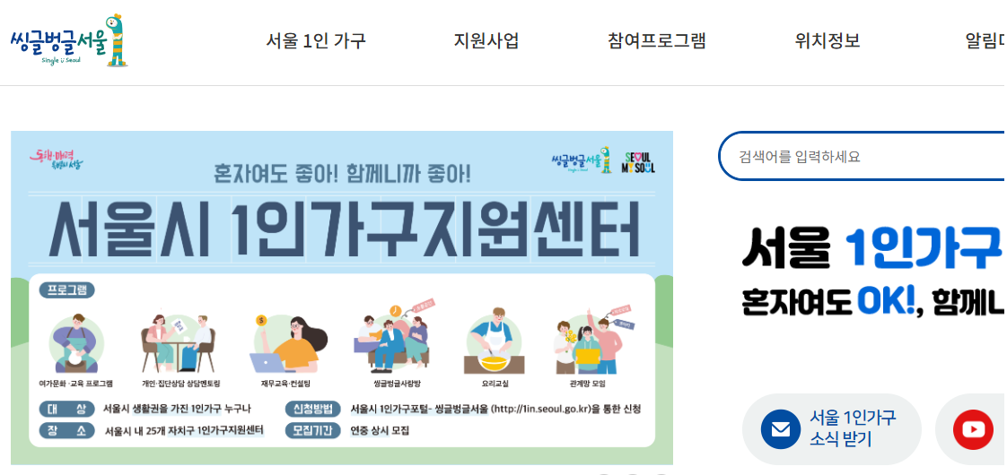 싱글벙글 서울 1인가구 포털에서는 1인가구를 위한 다양한 프로그램으로 1인가구가 사회구성원으로 공존하며 살아가는 데 필요한 정책을 마련하고 있습니다.