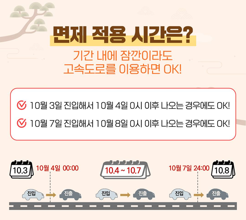 - 고속도로 통행료 면제 시작 : 10월 04일(토) 0시