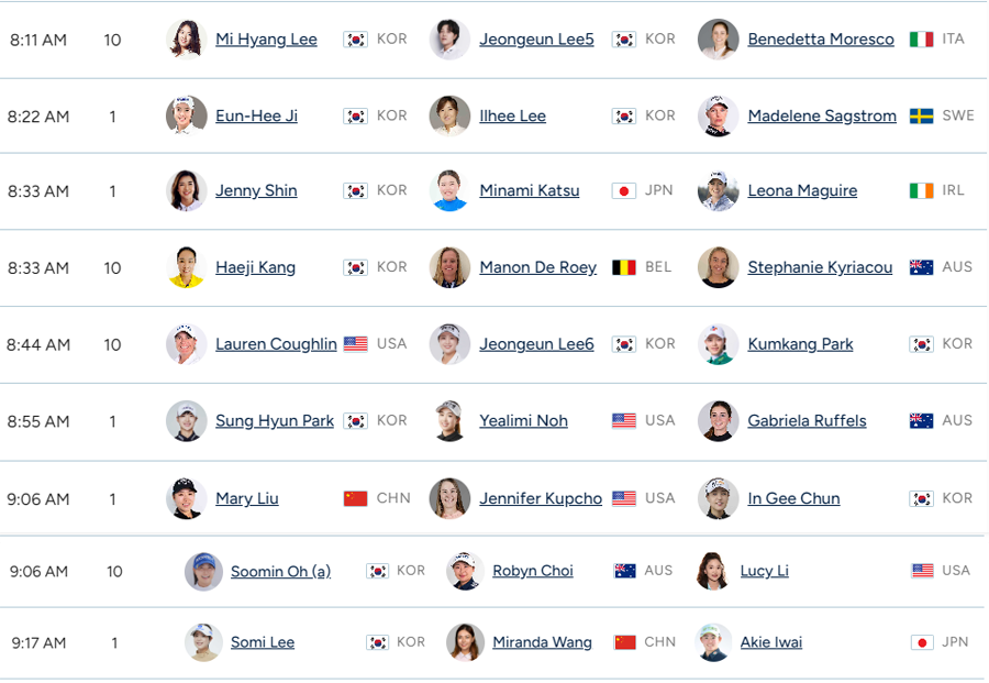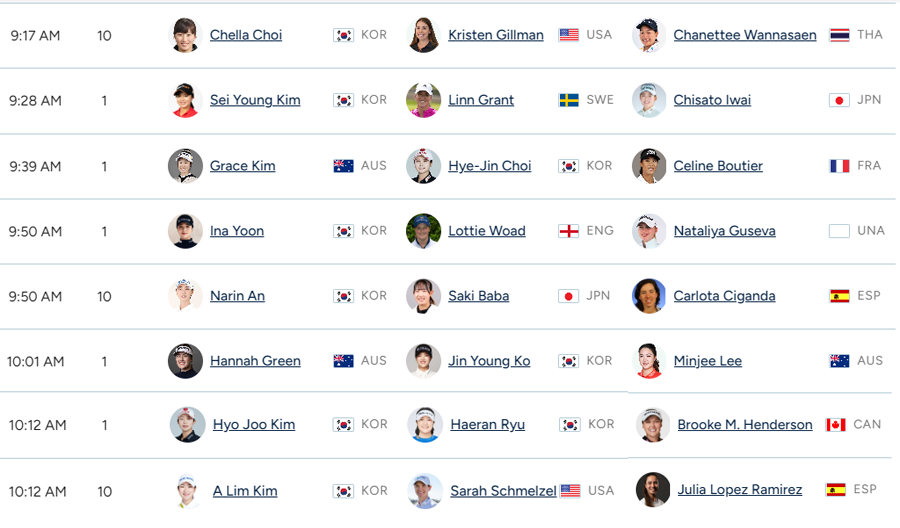 • 1라운드 윤이나 티타임 : 9시 50분(1번 홀)으로 로티 워드, 나탈리아 구세바와 동반 플레이