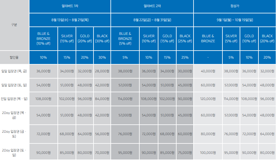 모든 티켓 및 패키지는 BMW 밴티지 회원 등급인 BLUE & BRONZE, SILVER, GOLD, BLACK에 따라 할인율이 다르게 적용됩니다.
