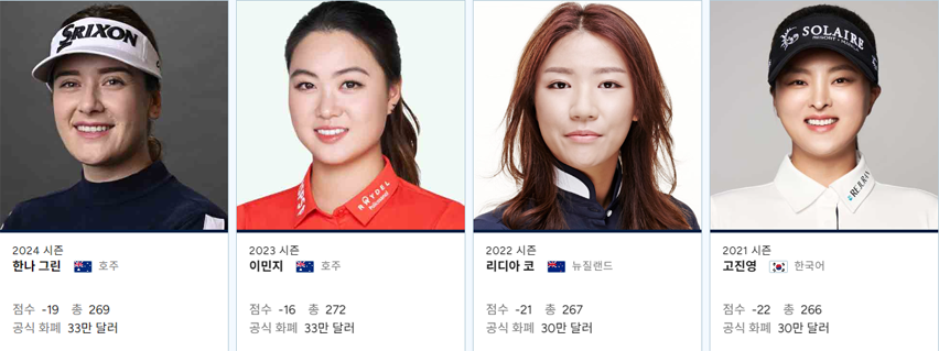 디펜딩 챔피언 한나 그린은 호주 국적으로 올 시즌 우승은 없고 파운더스 컵에서 공동 4위가 최고의 성적을 기록하고 있습니다.